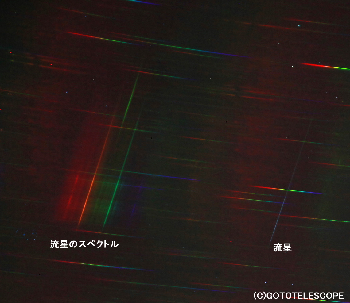 2013年のペルセ群は結構活動的でした。0次の分光されていない画像(右端)と1次のスペクトルが写っています。面白いのは流星が発光する前に発光している緑の輝線が存在すること。波長を簡単に計測すると、オーロラの緑輝線の位置に近いのですが、私は流星の研究者ではないので良く分かりません。すばるが画面左下に写っていて、流星が飛んだ位置が分かります。